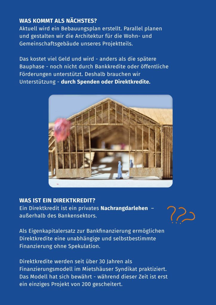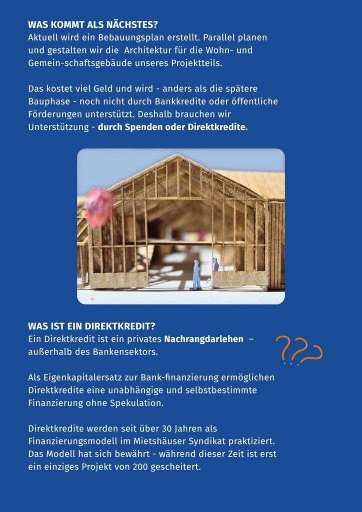 Das Finanzierungsmodell mit Direktkrediten wird seit über 30 Jahren im Mietshäuser Syndikat erfolgreich praktiziert. Wir wollen an das bewährte Modell zu solidarischen Finanzierung anknüpfen!