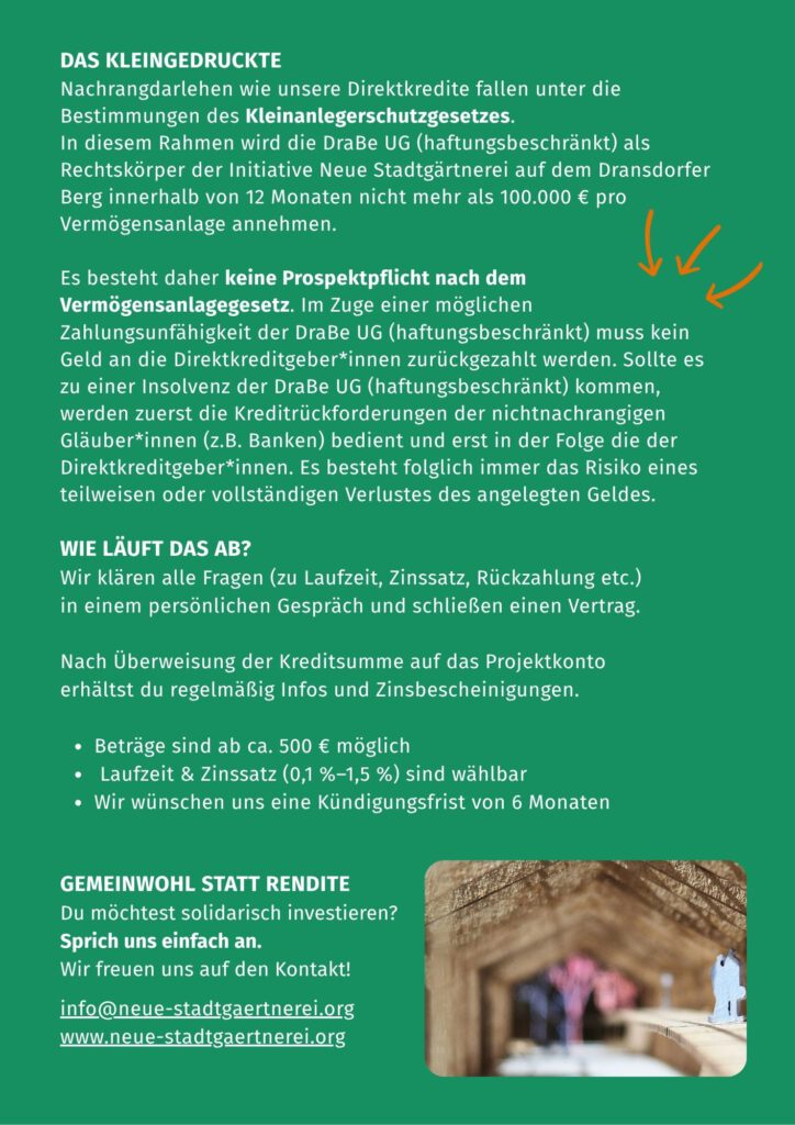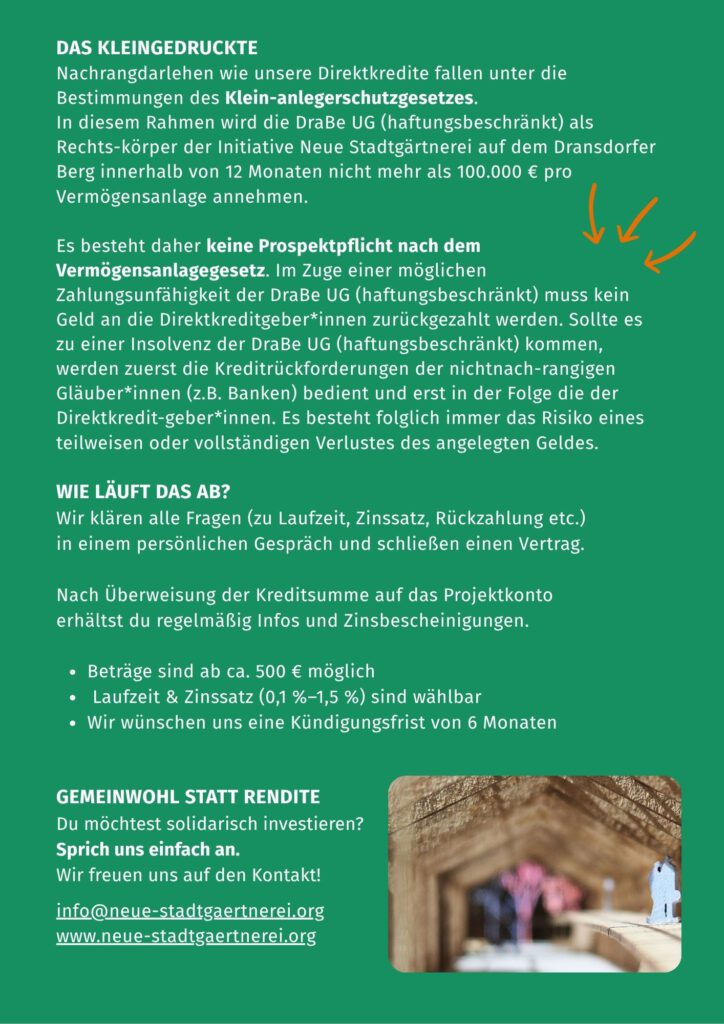 Die Direktkredite sind Nachrangdarlehen und fallen unter die Bestimmungen des Kleinanlegerschutzgesetzes. In diesem Rahmen werden durch die DraBe UG (haftungsbeschränkt) innerhalb von zwölf Monaten entweder maximal 20 Verträge zum gleichen Zinssatz oder nur Verträge bis zu einer Gesamtsumme von 100.000 Euro pro Zinsanlage abgeschlossen. Somit machen wir von der Ausnahmeregelung nach § 2 Abs. 1 Nr. 3a & § 2 Abs. 1 Nr. 3b VermAnlG Gebrauch und sind von der Prospektpflicht für Vermögensanlagen befreit.
