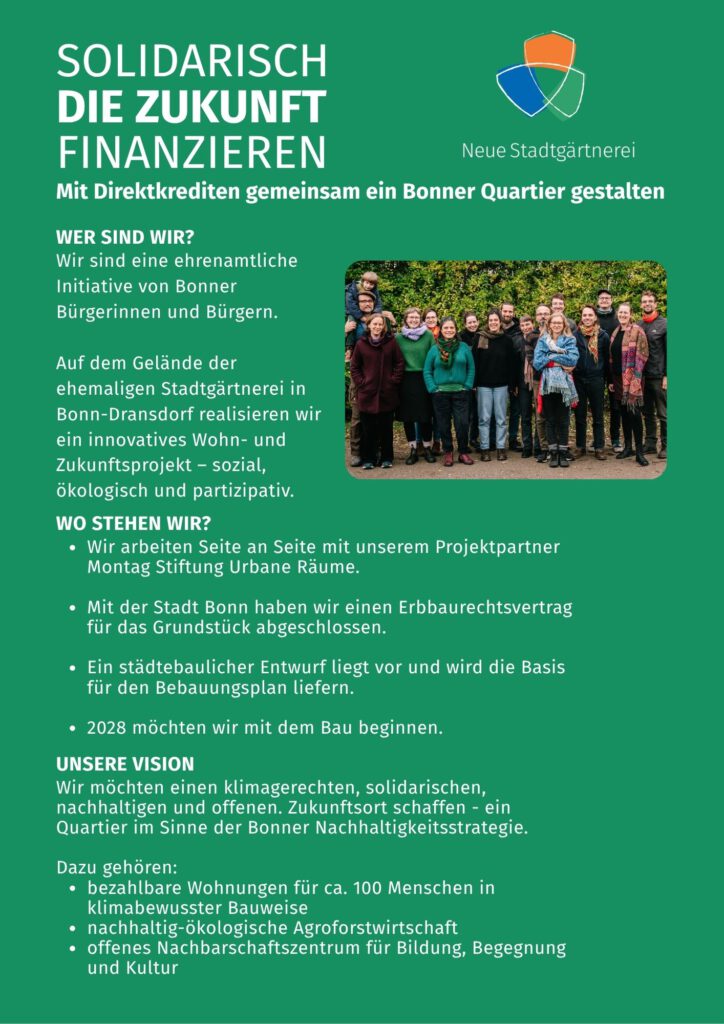 Mit Direktkrediten stemmen wir gemeinsam das nötige Eigenkapital für die Bauplanungskosten und die Aufnahme von Bankkrediten. Wir werden über die gesamte Projektlaufzeit und auch über den Einzug hinaus Direktkredite einwerben, um ablaufende Kredite zu ersetzen. Eine hohe Anzahl an Direktkrediten hilft, dabei die Zinslast gering zu halten und sichert so langfristig sozialverträgliche Mieten.